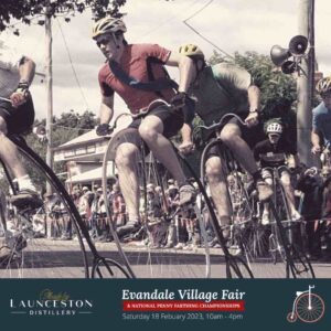 The Evandale Village Fair is held annually in February, and features a full program of Penny Farthing bicycle racing featuring the National Penny Farthing Championship. For the last 3 years Launceston Distillery has sponsored this local event and this year we are specifically sponsoring the Penny Farthing seniors race, the over 60’s race. Come down and support this local event.