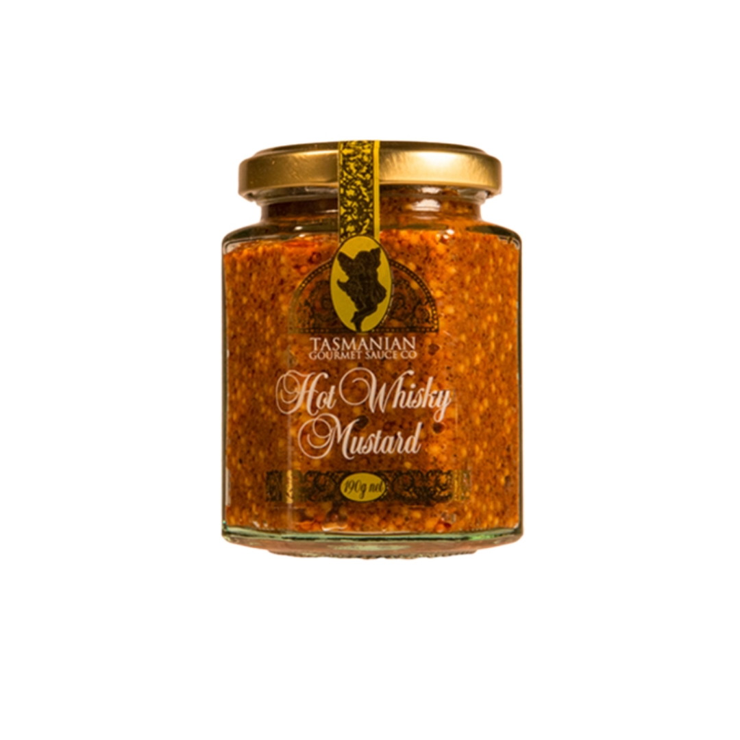 Produced by Tasmanian Gourmet Sauce Co, this whole-seed mustard is steeped in Tasmanian single malt whisky to develop its distinctive colour and robust character. Its bold, spicy profile pairs beautifully with meats, vegetables, and cheeses, making it a versatile addition to the pantry or a thoughtful inclusion in a Tasmanian gift pack.